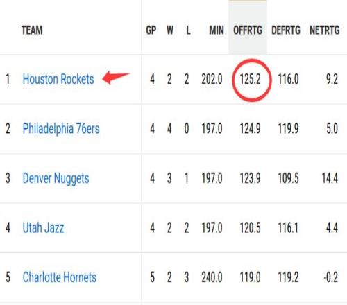 北京时间10月31日,失去范弗利特的火箭,如今进攻效率却排在联盟第一。数据显示,火箭前4场比赛百回合能得到125.2分,力压76人(124.9),高居联盟榜首。虽然样本不大,但火箭确实展示了他们在进攻端的统治力。
