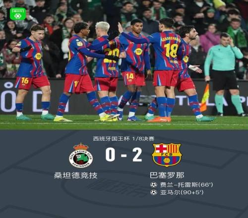 北京时间1月16日,西班牙国王杯1/8决赛展开较量,桑坦德竞技迎战巴塞罗那。上半场贝尔纳尔、亚马尔造险,下半场费兰-托雷斯单刀破门,桑坦德竞技两次破门被吹,亚马尔锁定胜局。最终全场比赛结束,桑坦德竞技0-2不敌巴塞罗那,后者顺利晋级下一轮。