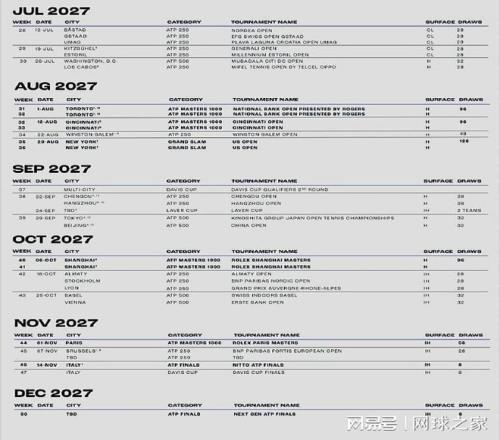 我们再来关注其它消息。北京时间今晨,ATP公布了2027赛季巡回赛的赛历。2027赛季,ATP巡回赛将覆盖全球29个国家和地区,共举办59项赛事,另加四项大满贯赛事,其中有7站大师赛将采用升级后的12天赛制。具体请看附图。