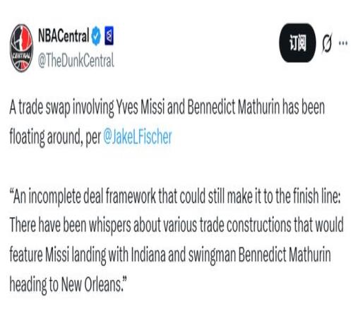 北京时间1月23日,据名记Fischer报道,印第安纳步行者队与新奥尔良鹈鹕队已就多套交易方案展开探讨,核心框架为将步行者队效力第四个赛季的后卫本内迪克特-马瑟林送至新奥尔良,同时换来鹈鹕队二年级中锋伊夫斯-米西。